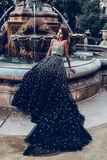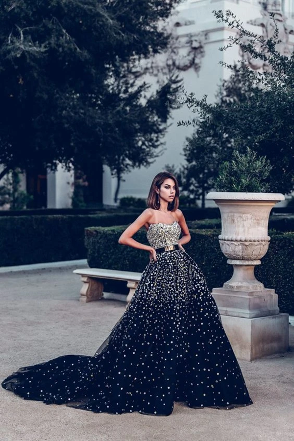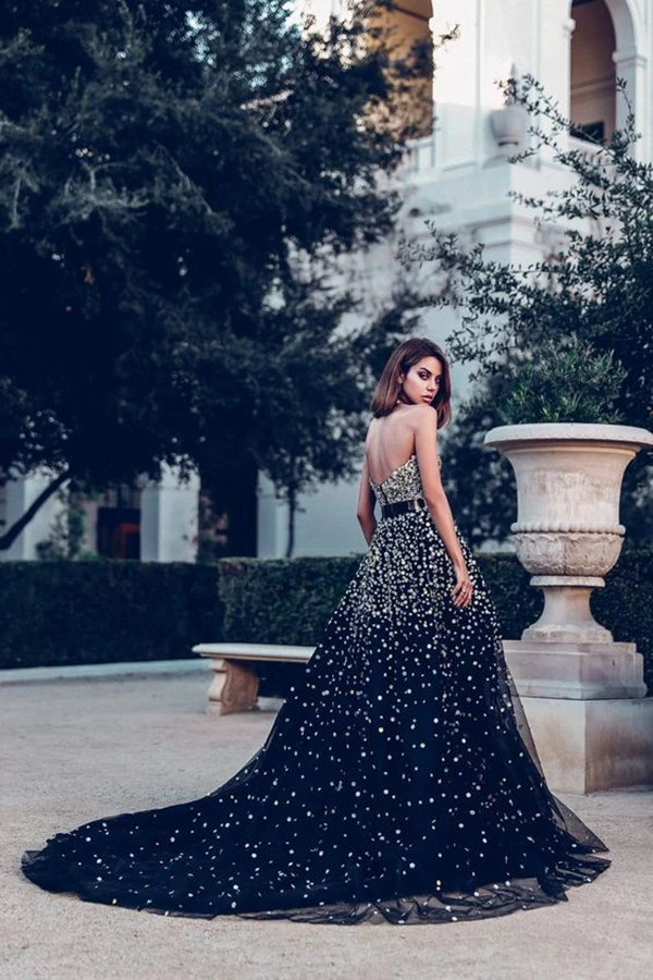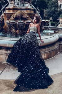 Promfast A line Black Sweetheart Beaded Long Prom Dresses Tulle Evening Dress PFP2026
