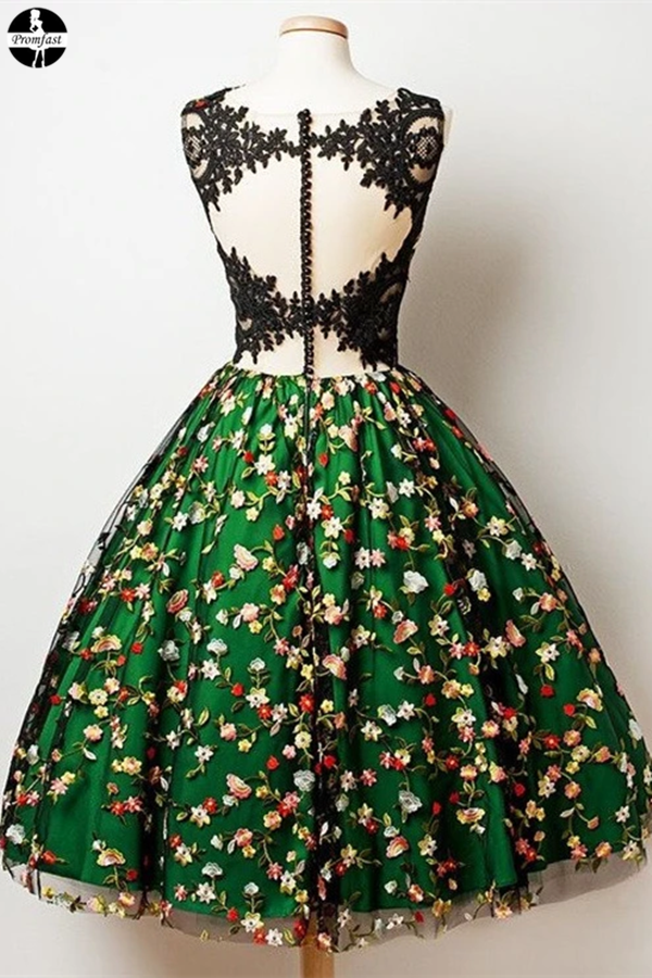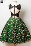 Promfast A-Line V-Neck Knee Length Sleeveless Dark Green Lace Homecoming Dress with Appliques PFH0320
