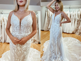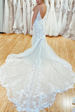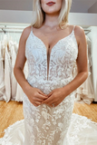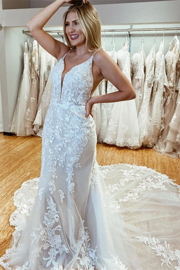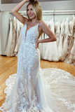 Promfast Amazing Spaghetti Straps Appliques Lace Wedding Dresses Mermaid Chapel Train Bridal Gowns PFW0592