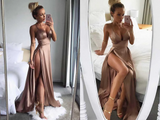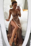 Promfast Brown Satin Thigh High Slit Deep V Neck Spaghetti Straps Long A Line Prom Dresses PFP2109