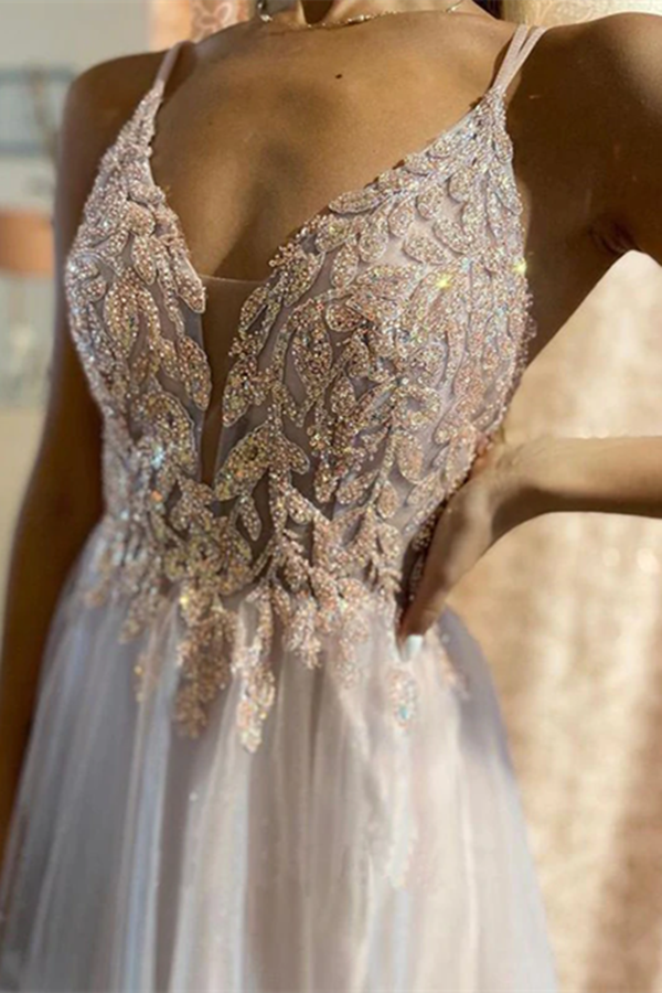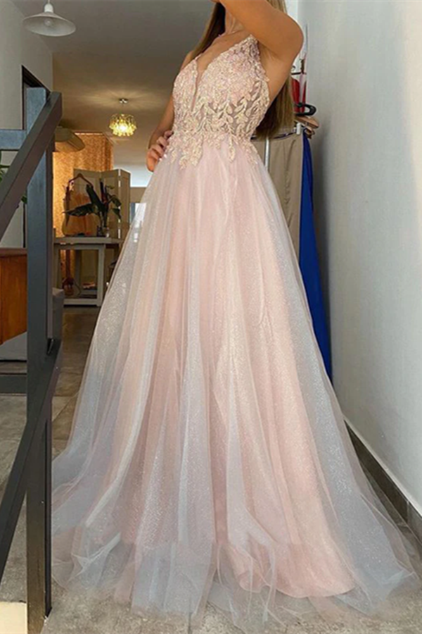Promfast Cheap A line Spaghetti Straps V neck Prom Dress Long Applique Tulle Evening Dresses PFP2202
