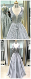 Promfast Chic A line Straps Lace Prom Dresses Silver Applique Long Prom Dress Evening Dress PFP2256