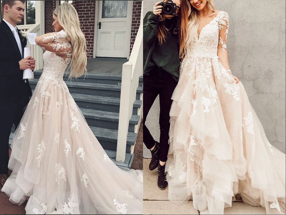 Promfast Gorgeous Lace A line V neck Long Sleeves Wedding Dresses with Train PFW0586
