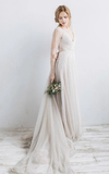 Promfast Long Sleeve V Neck Illusion Tulle Weddig Dress With Beading PFW0546