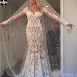 Promfast Romantic Long Appliques Backless Lace Mermaid Ivory Long Sleeve Wedding Dresses PFW0499