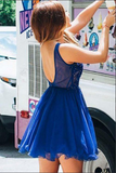 Promfast Royal Blue Tulle A line V neck Beaded Homecoming Dress With Appliques PFH0403
