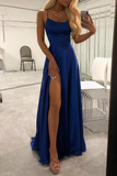 Promfast Simple Blue Spaghetti Straps Long Prom Dresses Evening Dress with Thigh Slit PFP2216
