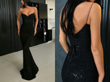 Promfast Sparkle Black Mermaid V neck Spaghetti Strapes Sequins Long Prom Dresses PFP2049