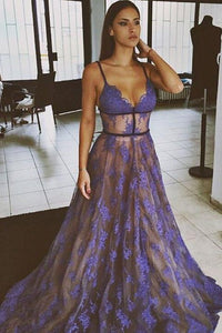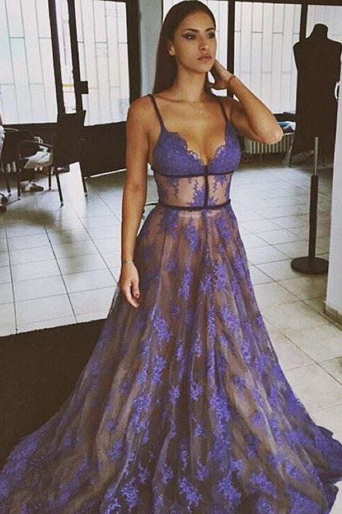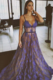 Purple Lace Spaghetti Straps Nude Lining Long Sexy Prom Dress PFP0381