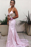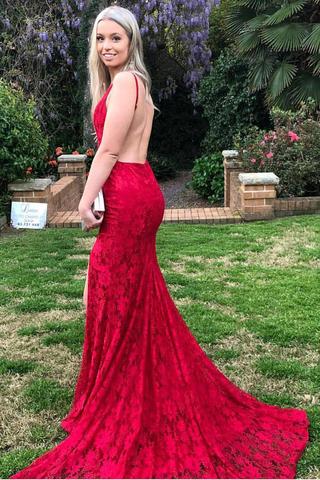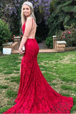 Red Lace Spaghetti Strap Backless Prom Dresses, Mermaid Prom Dress PFP0464