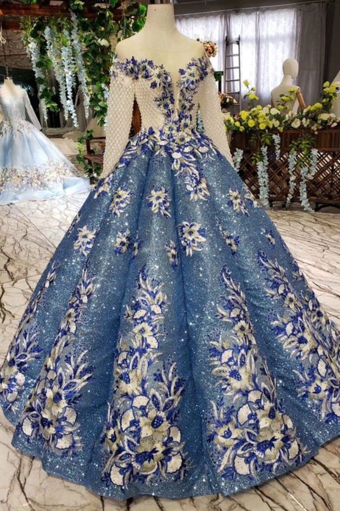 Scoop Long Sleeves Lace Up Back Blue Appliques Prom Dresses PFP1384