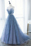 Shiny Tulle V Neck Blue Long Prom Dress, Blue Tulle Formal Evening Dress, Blue Ball Gown PFP2360