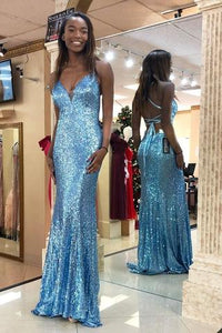 Sky Blue Sequin Sparkly Spaghetti Strap V Neck Prom Dresses,Formal Evening Dress PFP0566