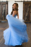 Sky Blue Tulle Long Sweetheart A line Lace Top Prom Dresses PFP0306