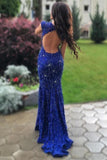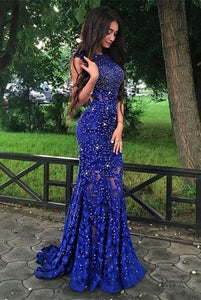Sparkly Royal Blue Lace Beaded Long Mermaid Backless Prom Dresses Evening Dresses PFP1042