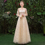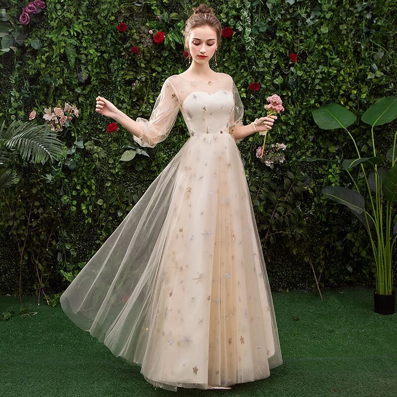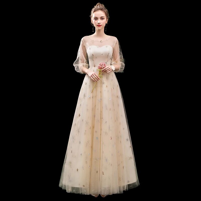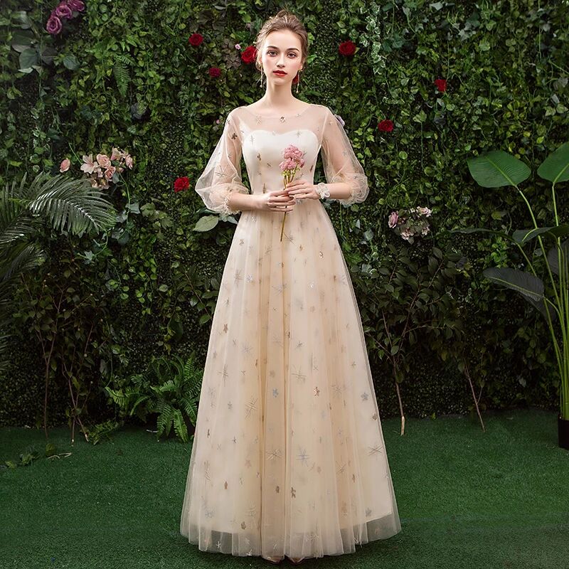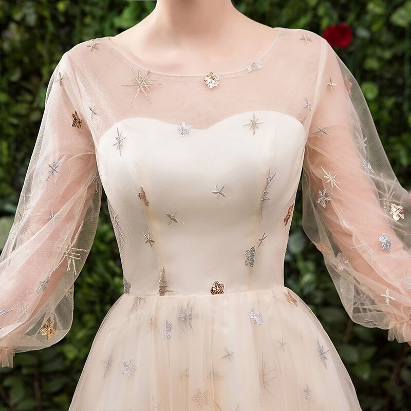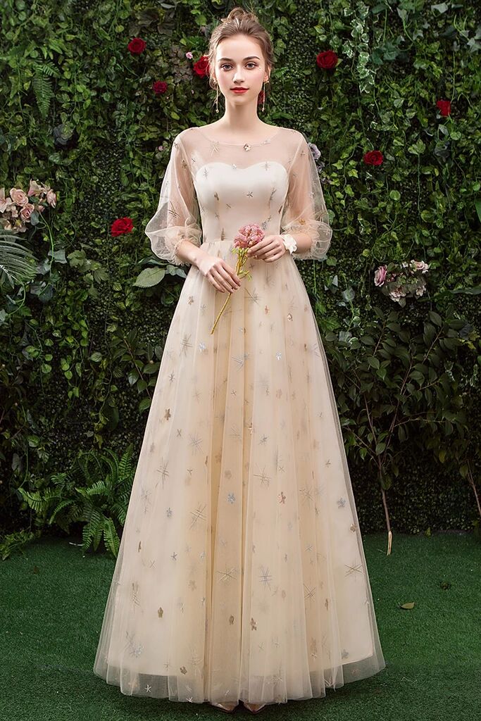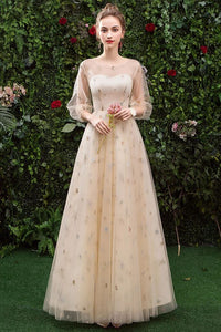 Stunning A Line 3/4 Sleeves Tulle Round Neck Prom Dress Evening Dresses PFP1606
