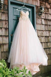 Sweetheart Strapless Flowers Beading Pleated Blush Pink Wedding Dress With Court Train PFW0182