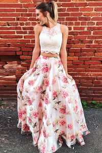Two Piece Floral Long Lace A Line Prom Dress Graduation Party Dress PFP0373