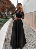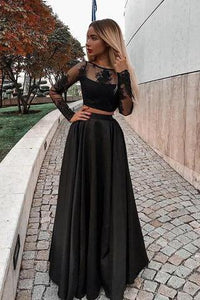 Two Piece Long Sleeve Floor-Length Black Prom Dress with Lace Appliques PFP0529