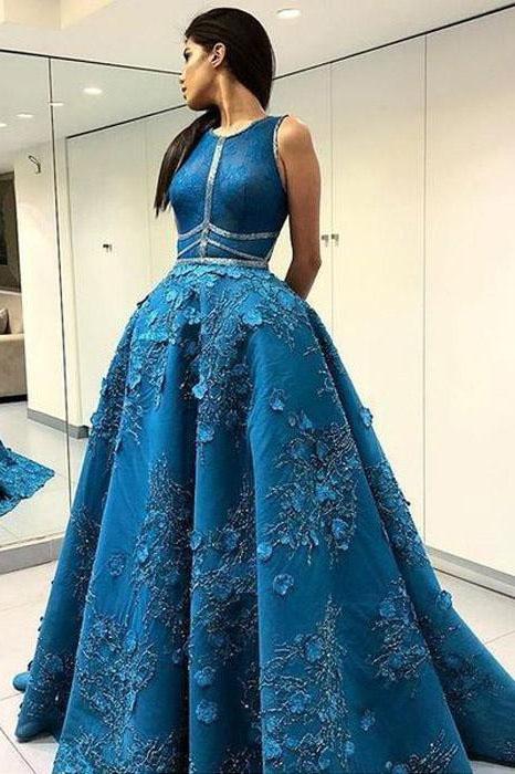 Unique Applique Formal A Line Blue Long Cheap Prom Dresses PFP0049