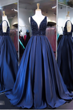 Unique Royal Blue A Line V Neck Sleeveless Long Prom Dress PFP0872