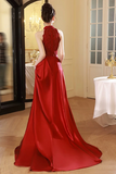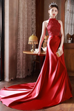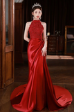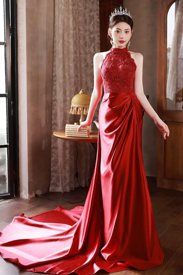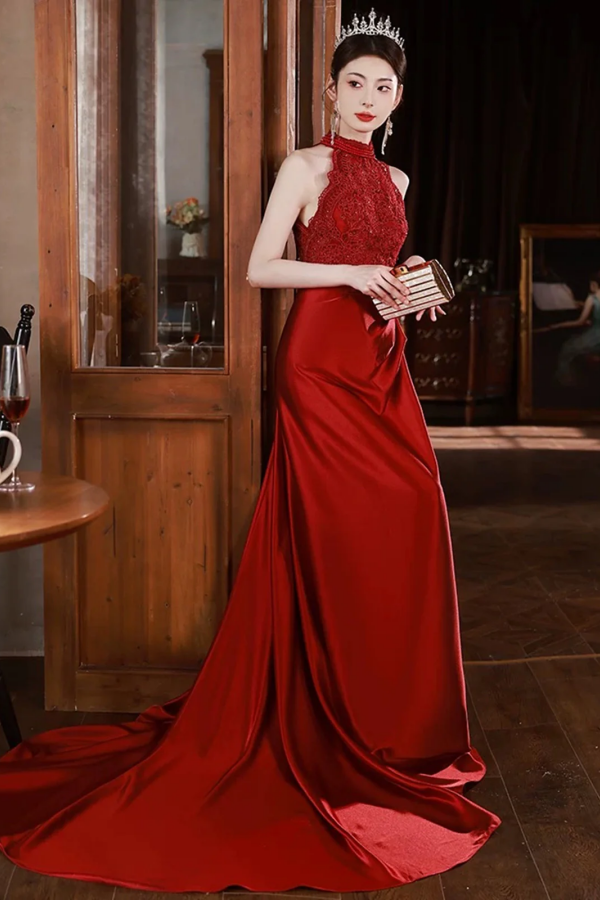 Wine Red Lace and Satin Halter Mermaid Long Party Dress, Wine Red Prom Dress PFP2749