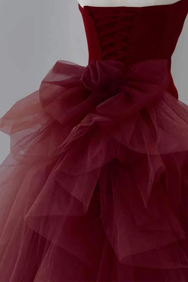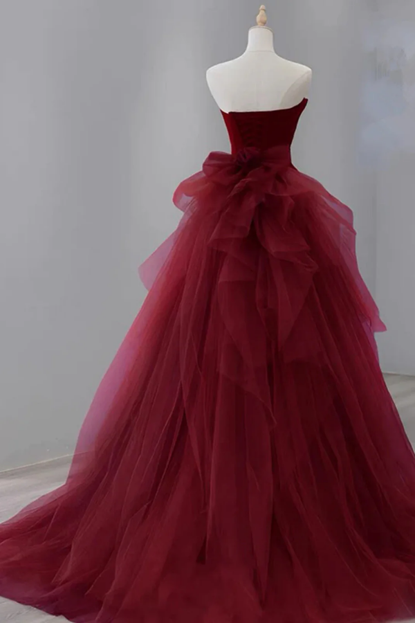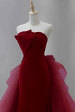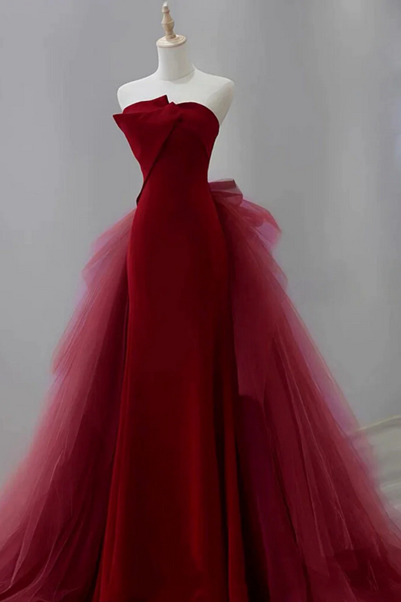 Wine Red Satin and Tulle Long Party Dress, Strapless Formal Dress PFP2744
