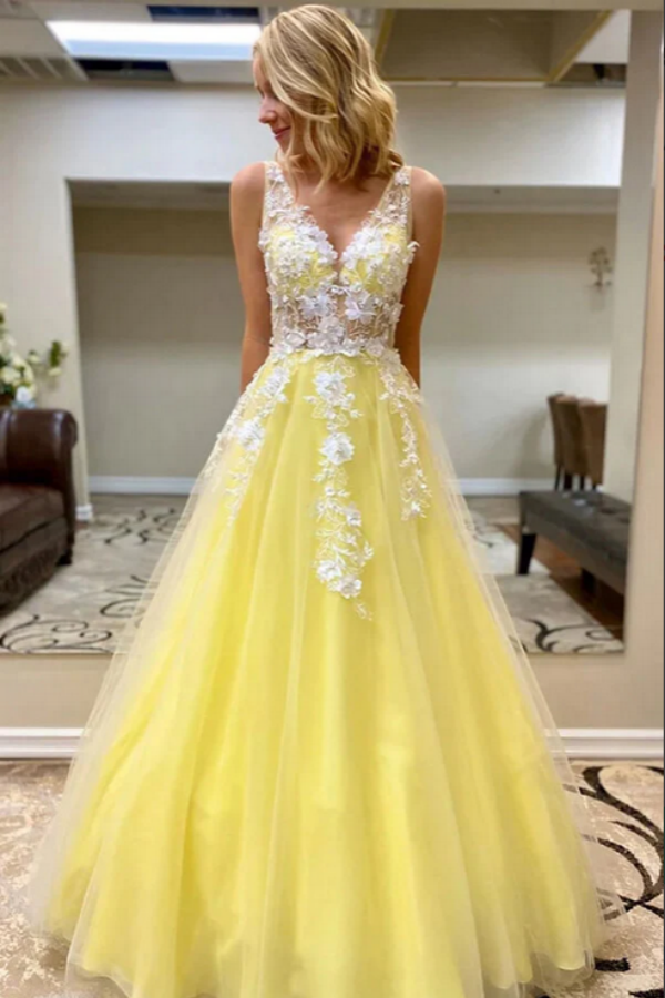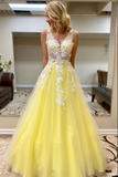 Yellow Princess A line Sleeveless Lace Appliques Prom Dresses, Evening Gowns PFP2319